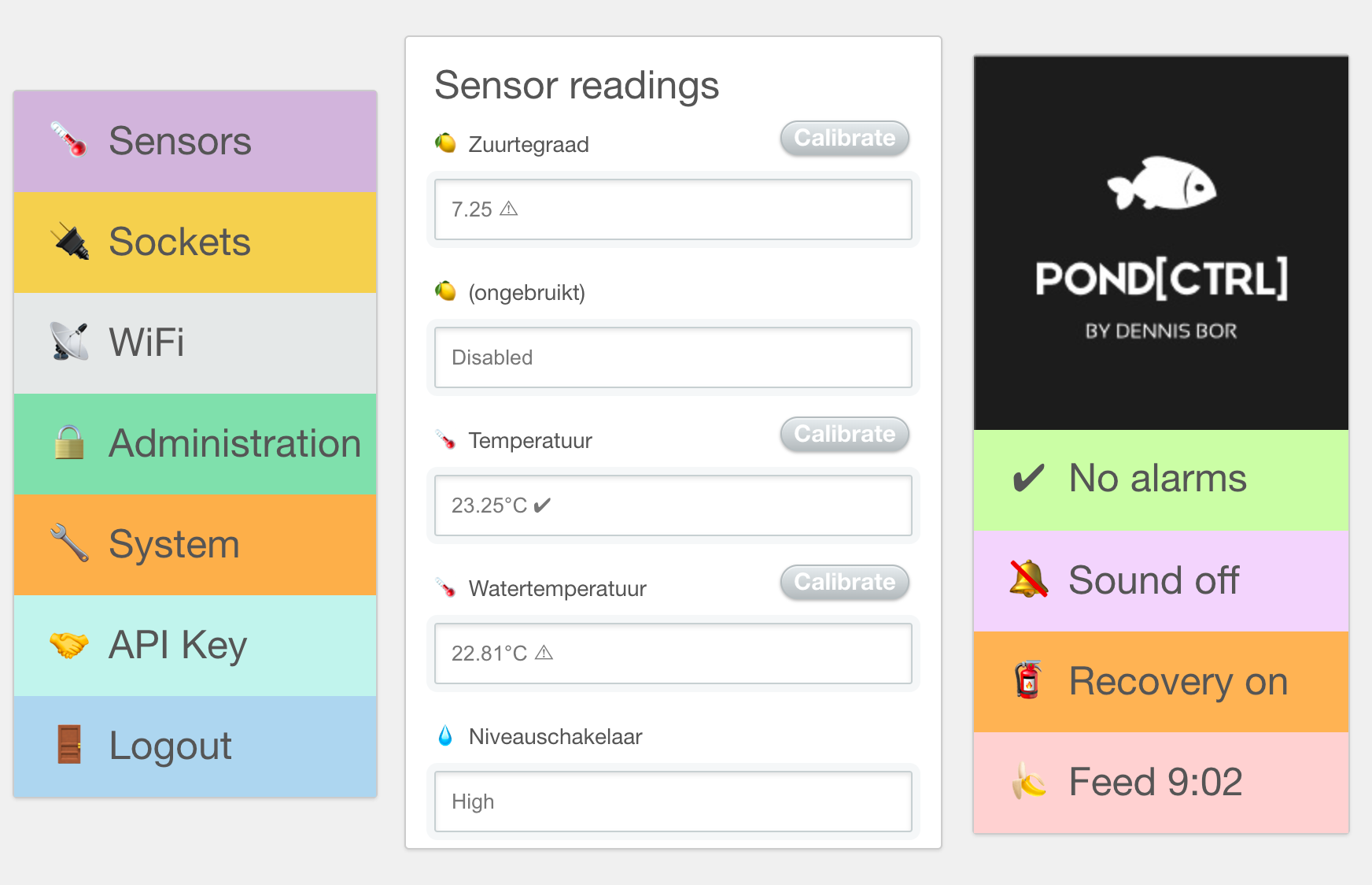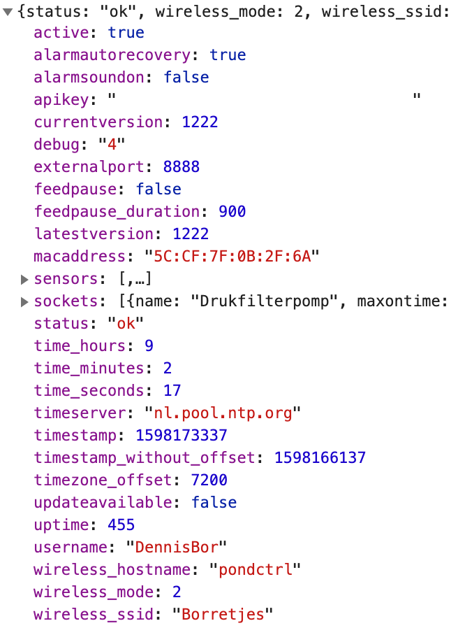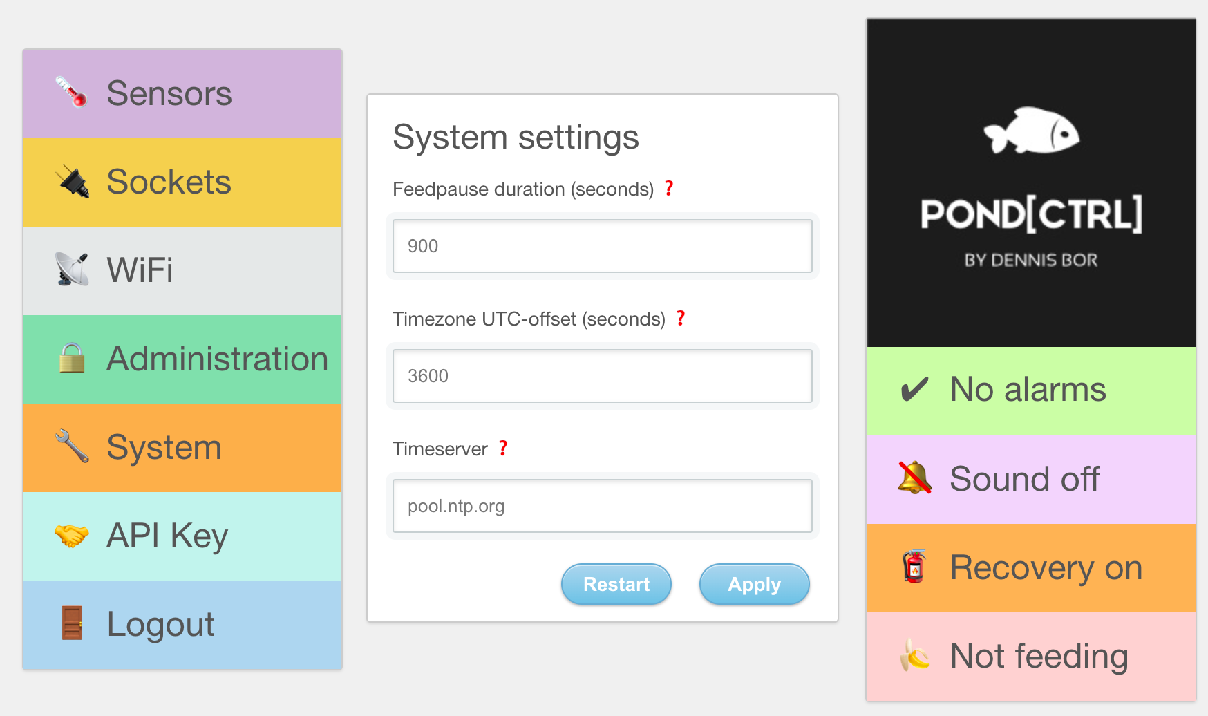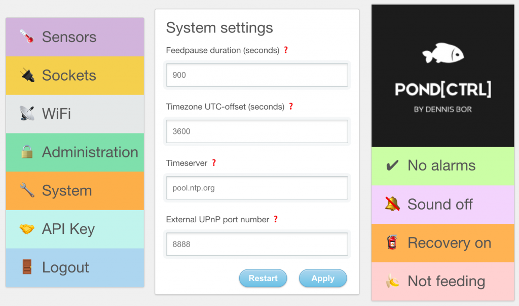 Nieuwe ‘System settings’ waar duur van voederpauze, tijdzone en tijdserver opgegeven kunnen worden. Via dit scherm kan ook de module herstart worden.Output van /get vanaf Pond[CTRL], waarin timeserver, timestamp timestamp_without_offset, timezone_offset en feedpause_duration toegevoegd zijn sinds de laatste update.