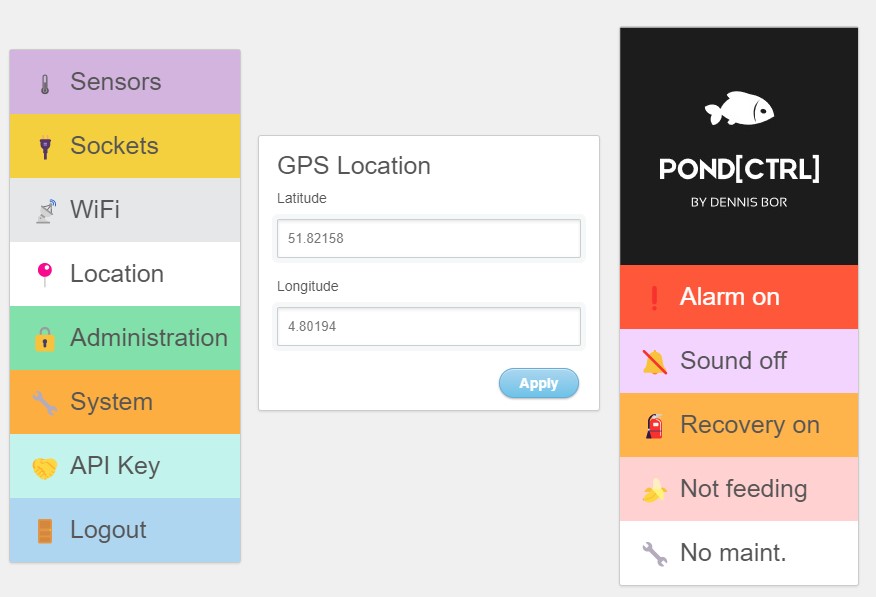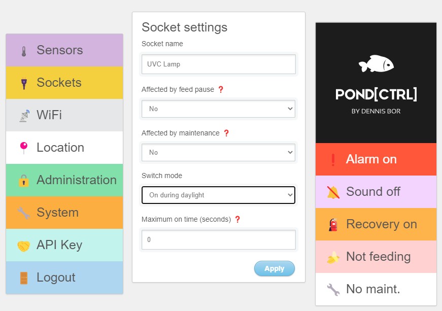 Nieuw: schakelbare stekkers zijn nu schakelbaar op dag/nacht. In de gebruikersinterface kunnen GPS-coördinaten ingevuld worden waarop het schakelen gebaseerd wordt. Dit werkt alleen bij een actieve verbinding met de Pond[CTRL] servers. Wanneer de verbinding niet actief is, dan wordt de stekker uitgeschakeld.